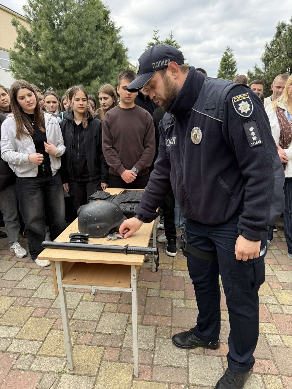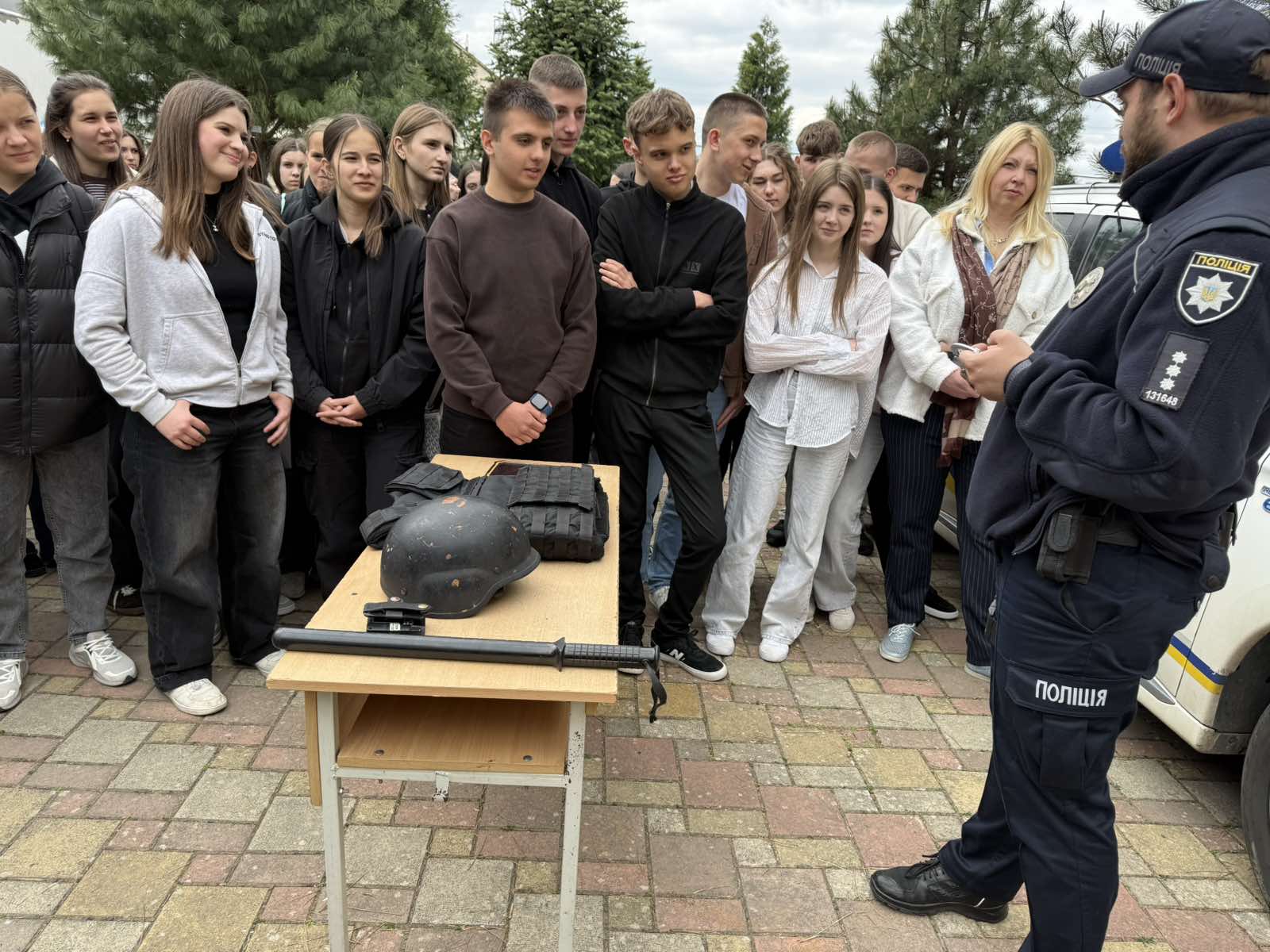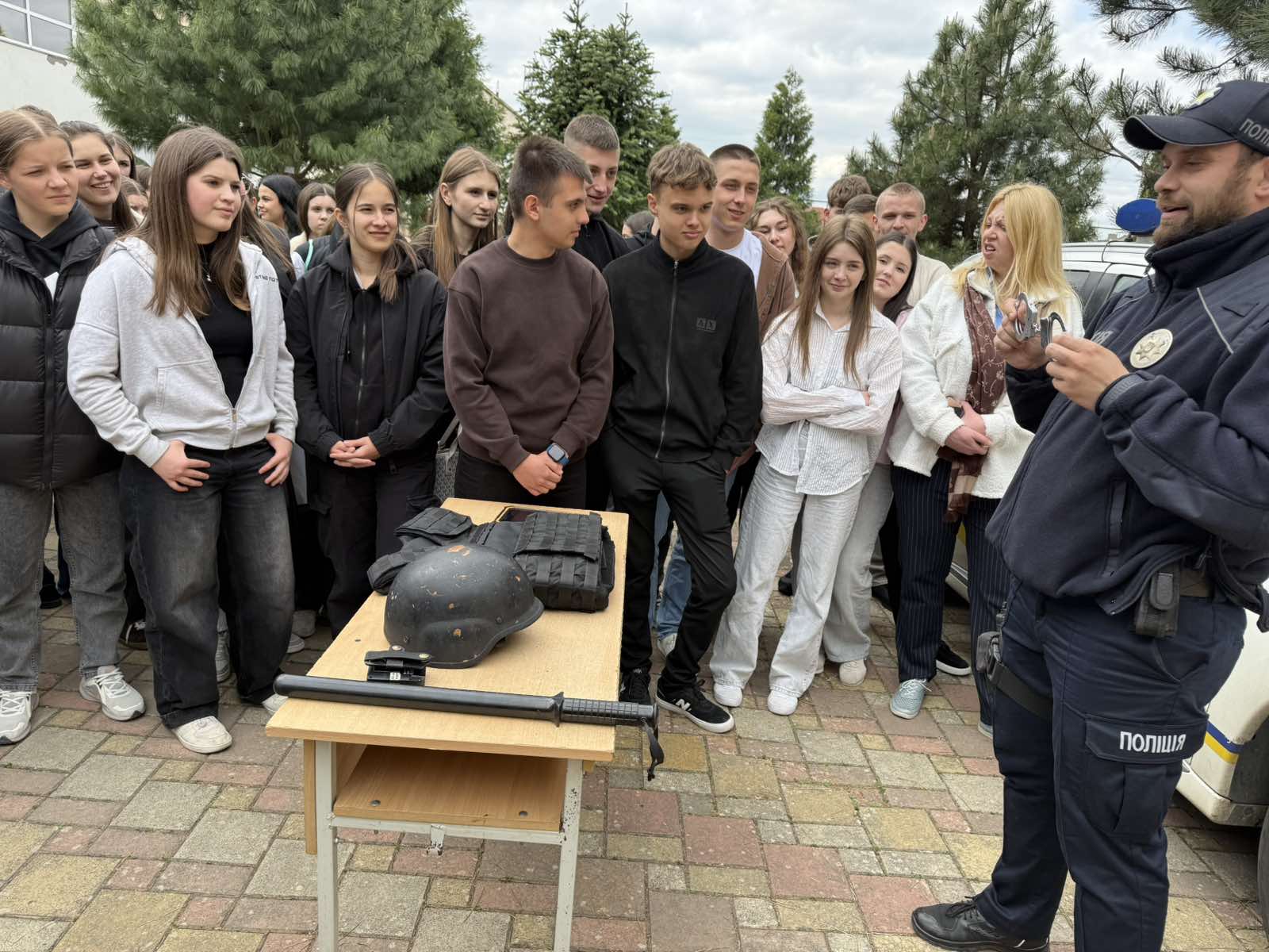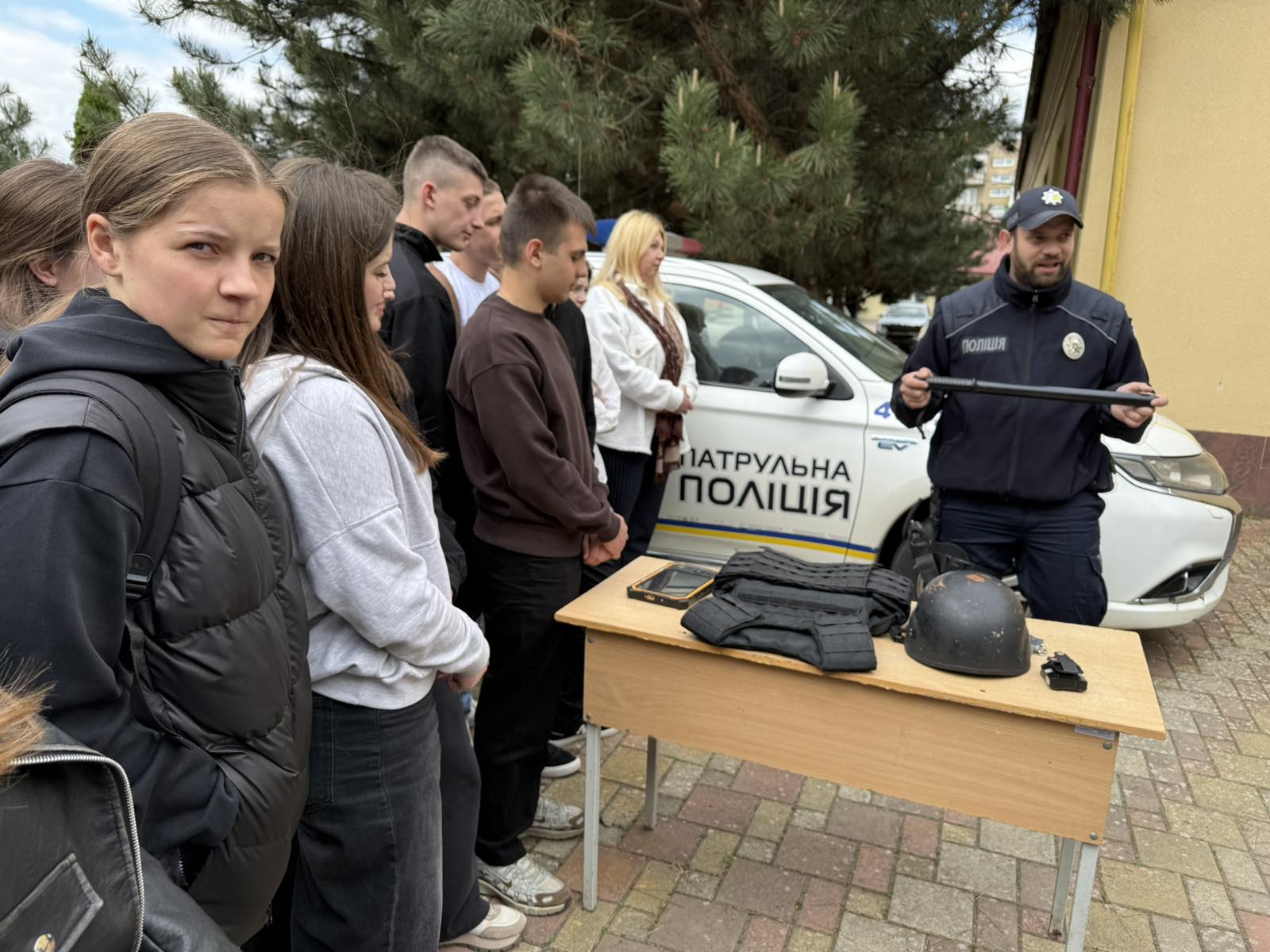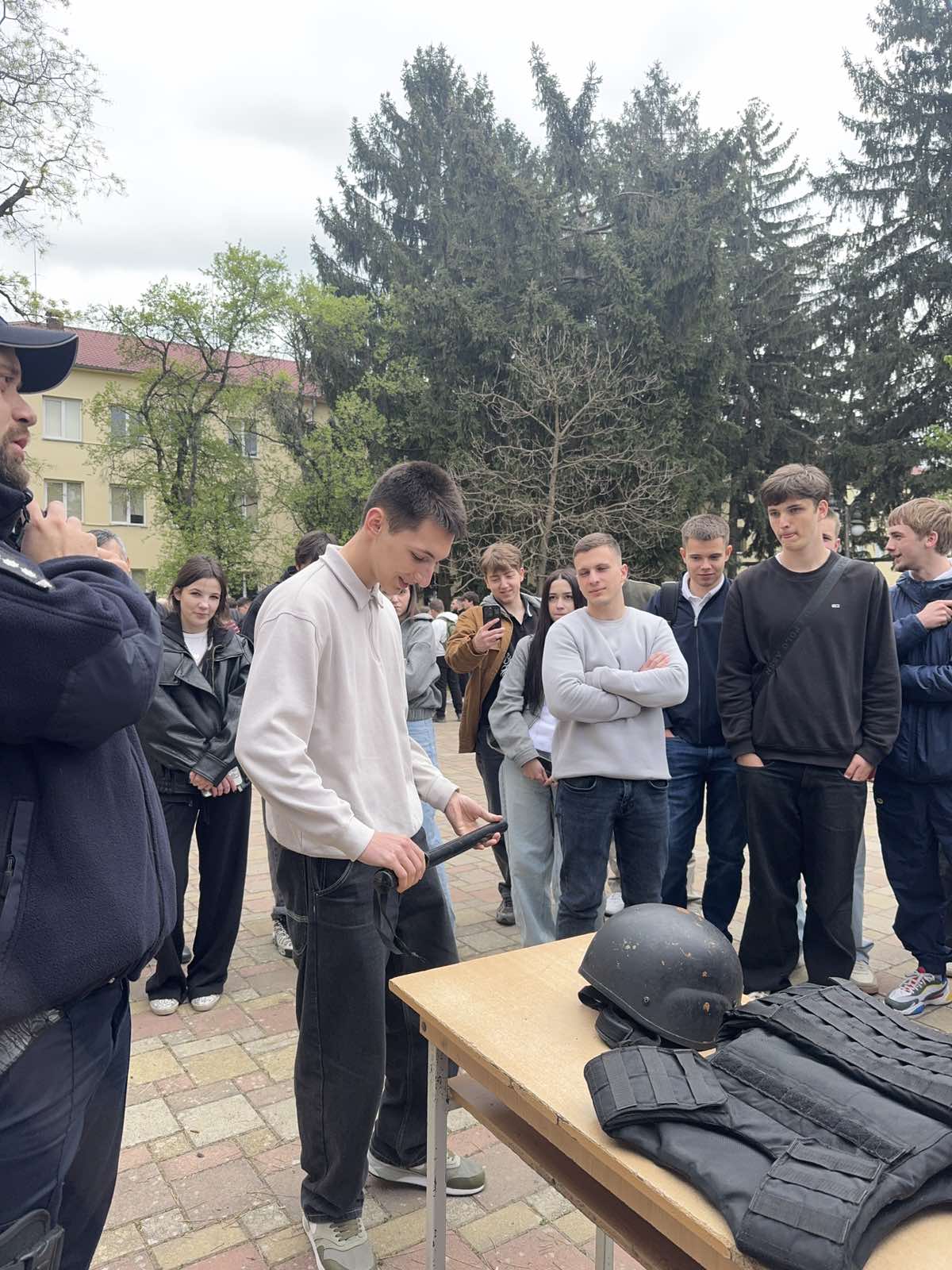 Офіцер служби безпеки провів ознайомлення з елементами екіпірування поліцейського та розповів про його призначення й особливості використання в роботі.