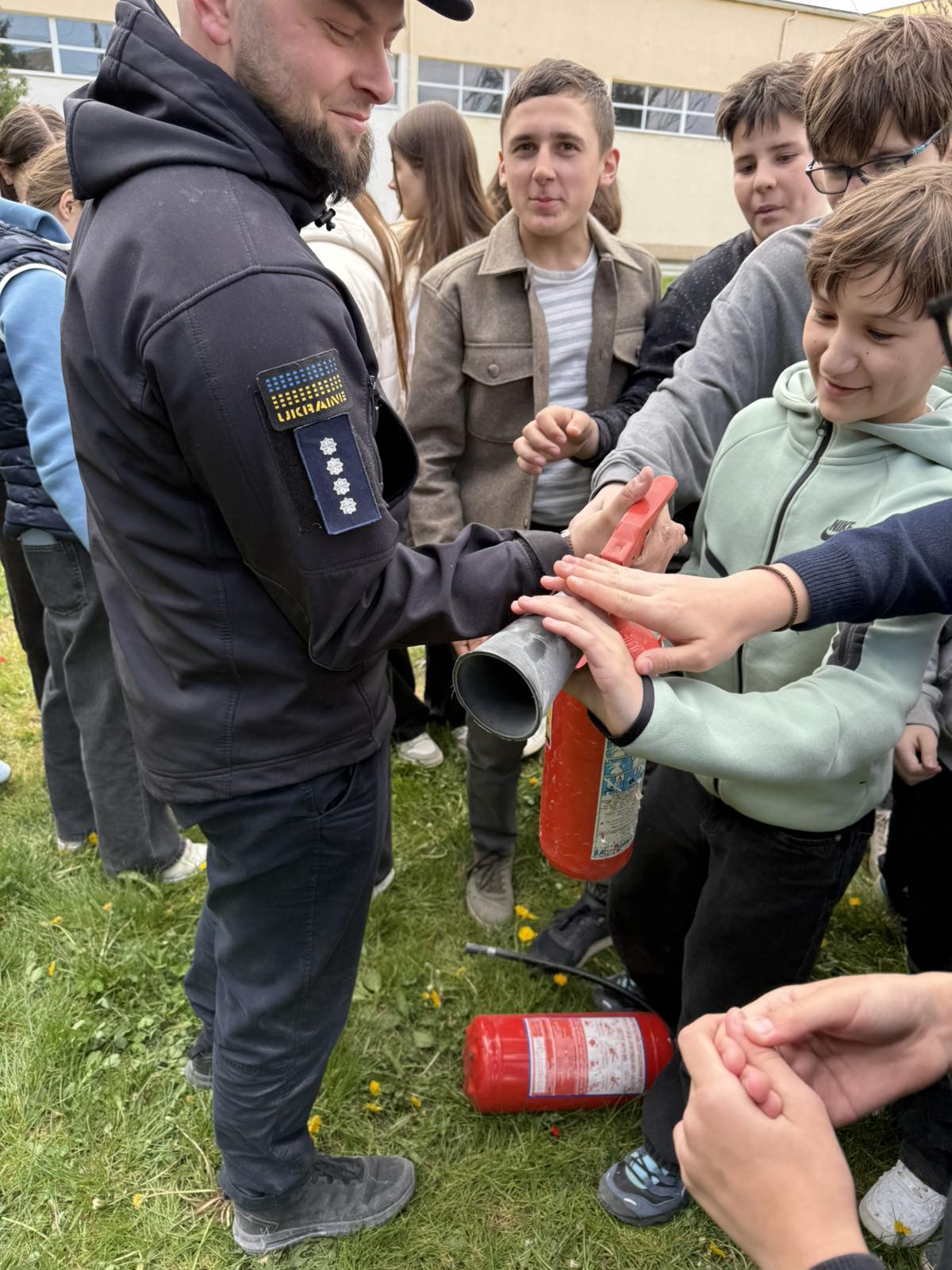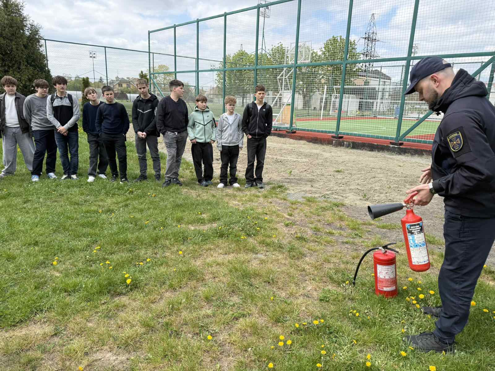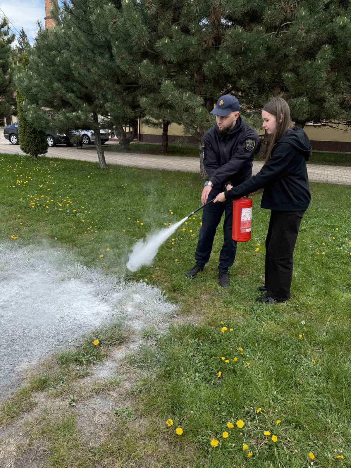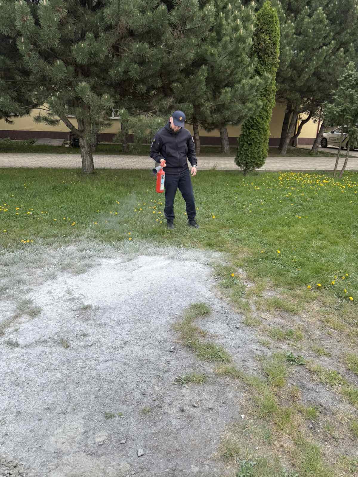 Працівники ДСНС продемонстрували практичні навички користування вогнегасником, пояснили принцип його дії та дали можливість учням побачити процес ліквідації умовного займання.