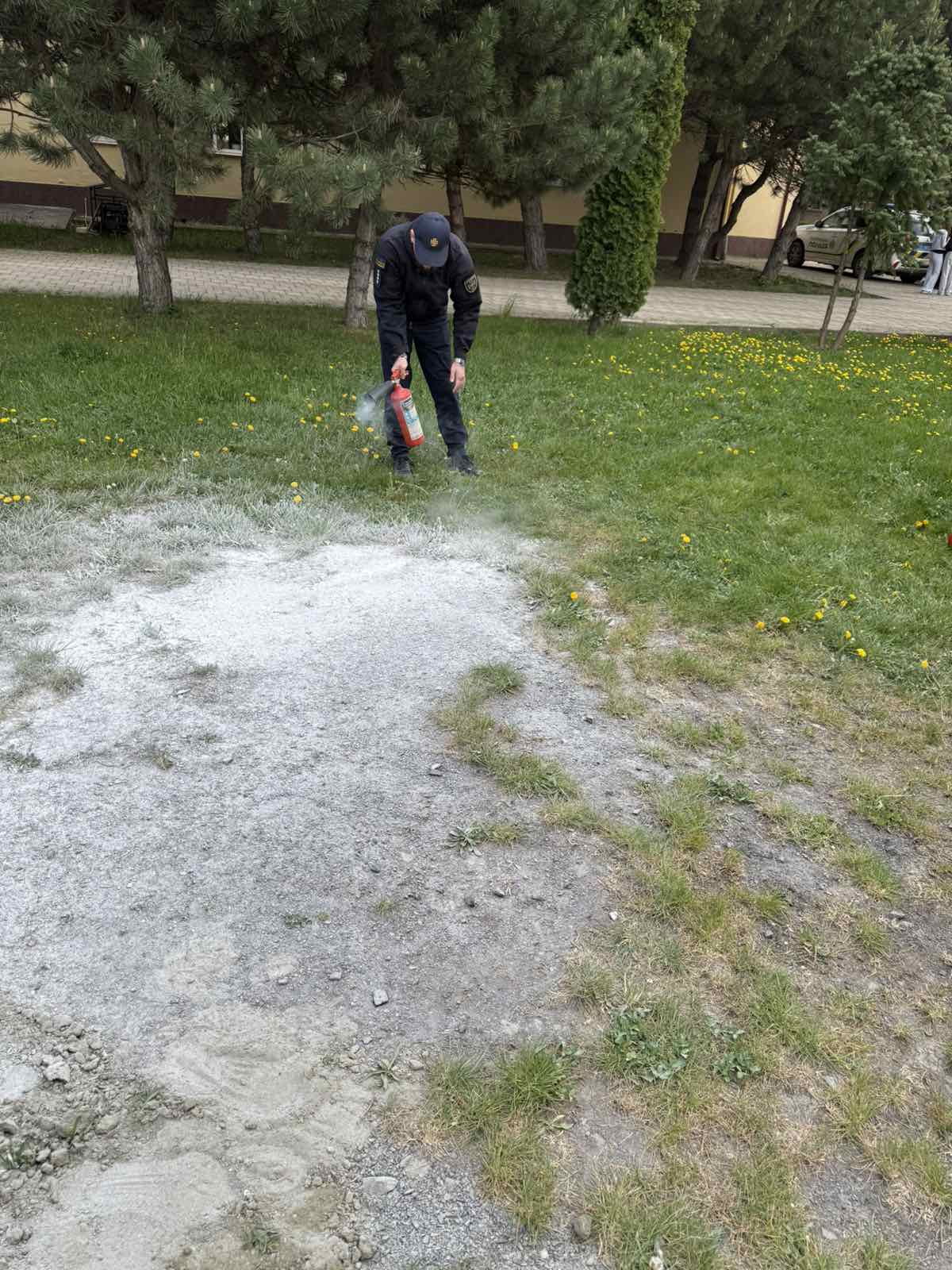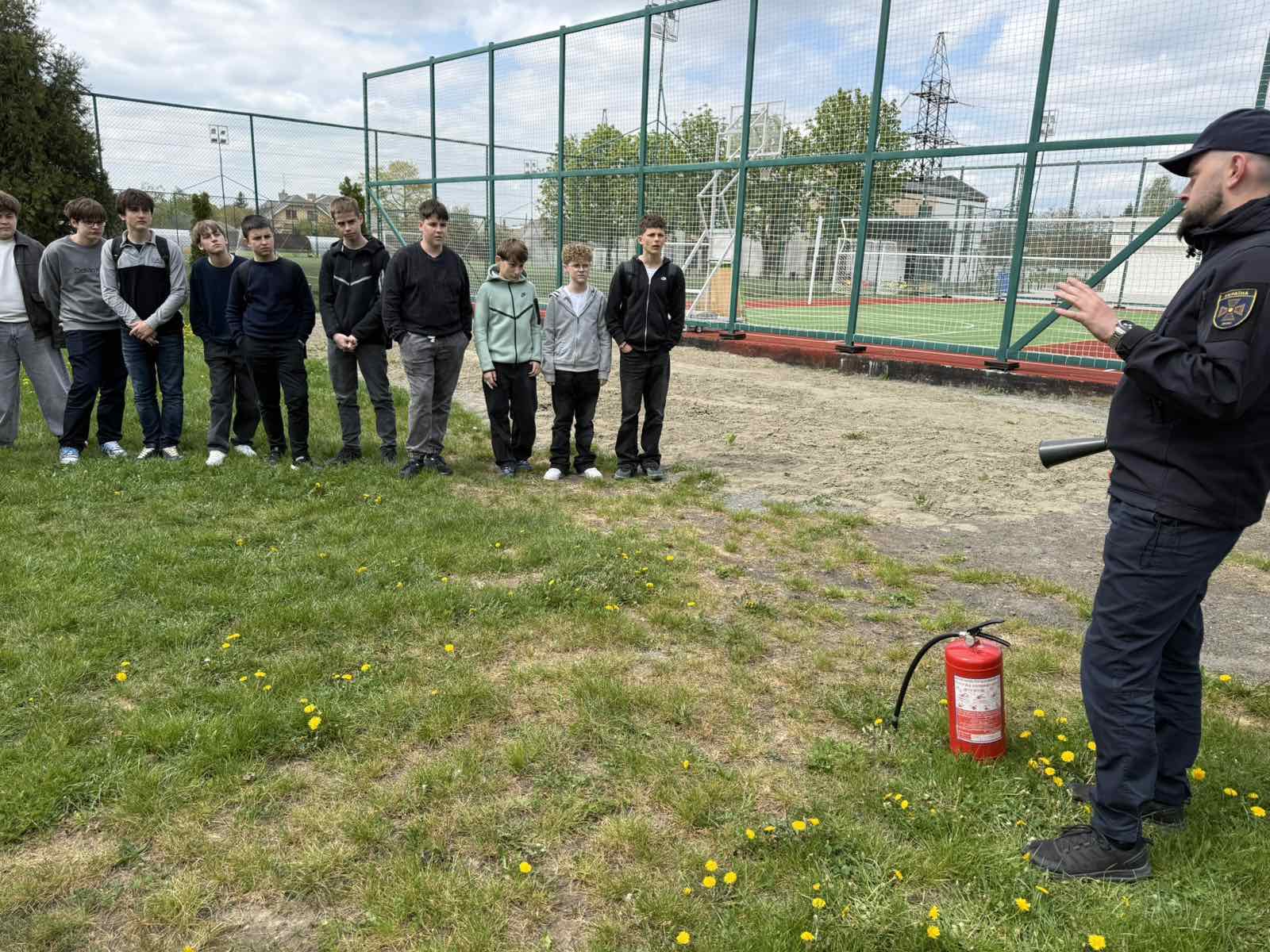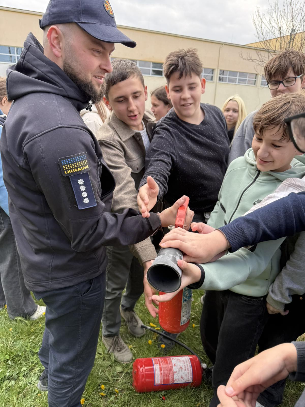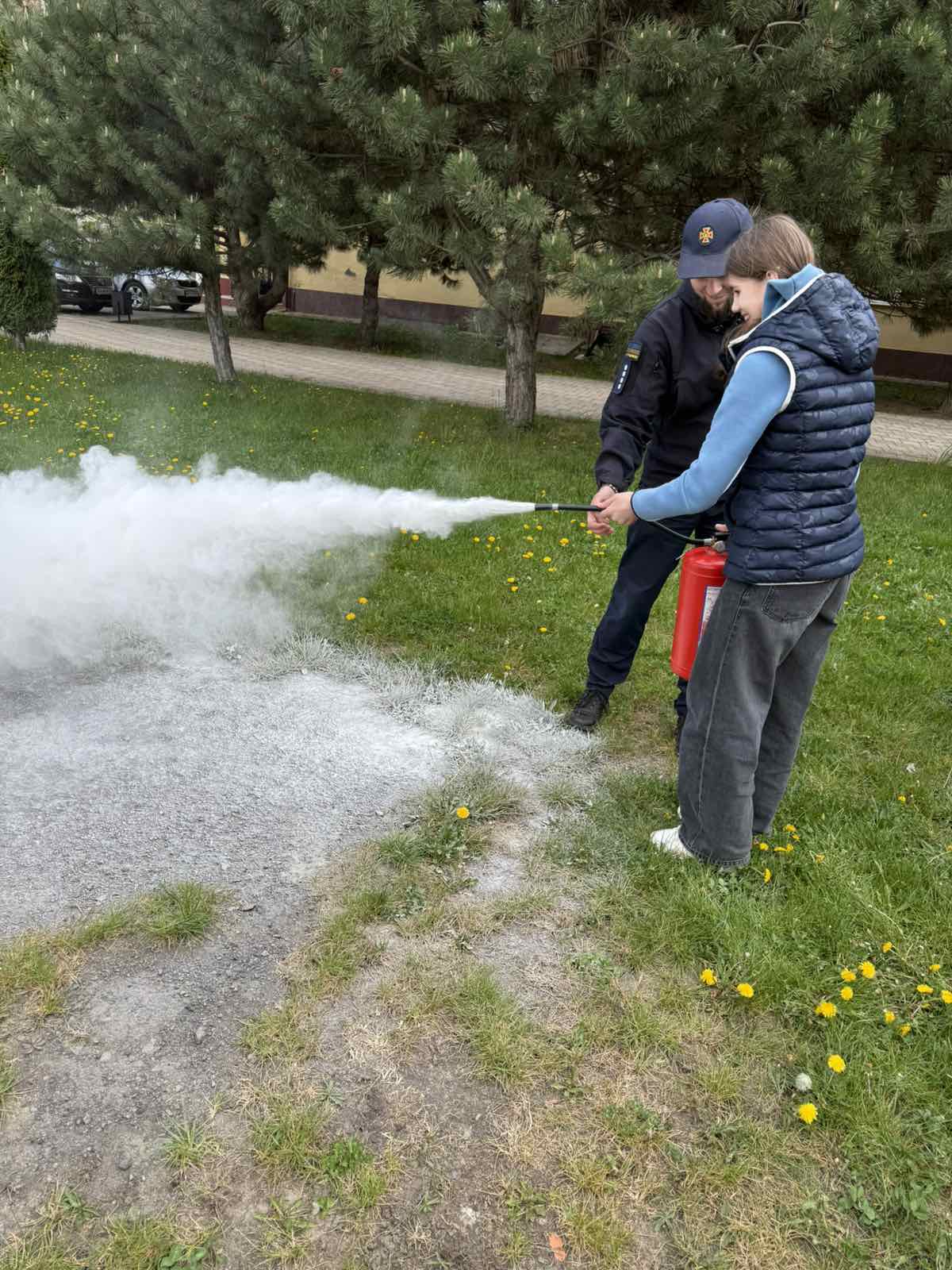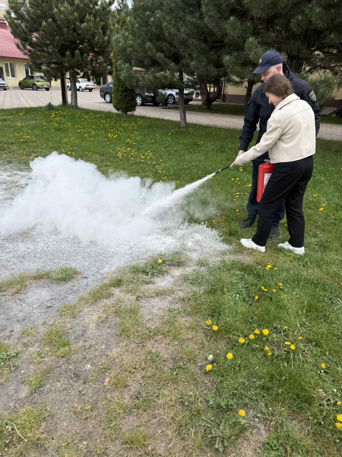 Працівники ДСНС продемонстрували практичні навички користування вогнегасником, пояснили принцип його дії та дали можливість учням побачити процес ліквідації умовного займання.